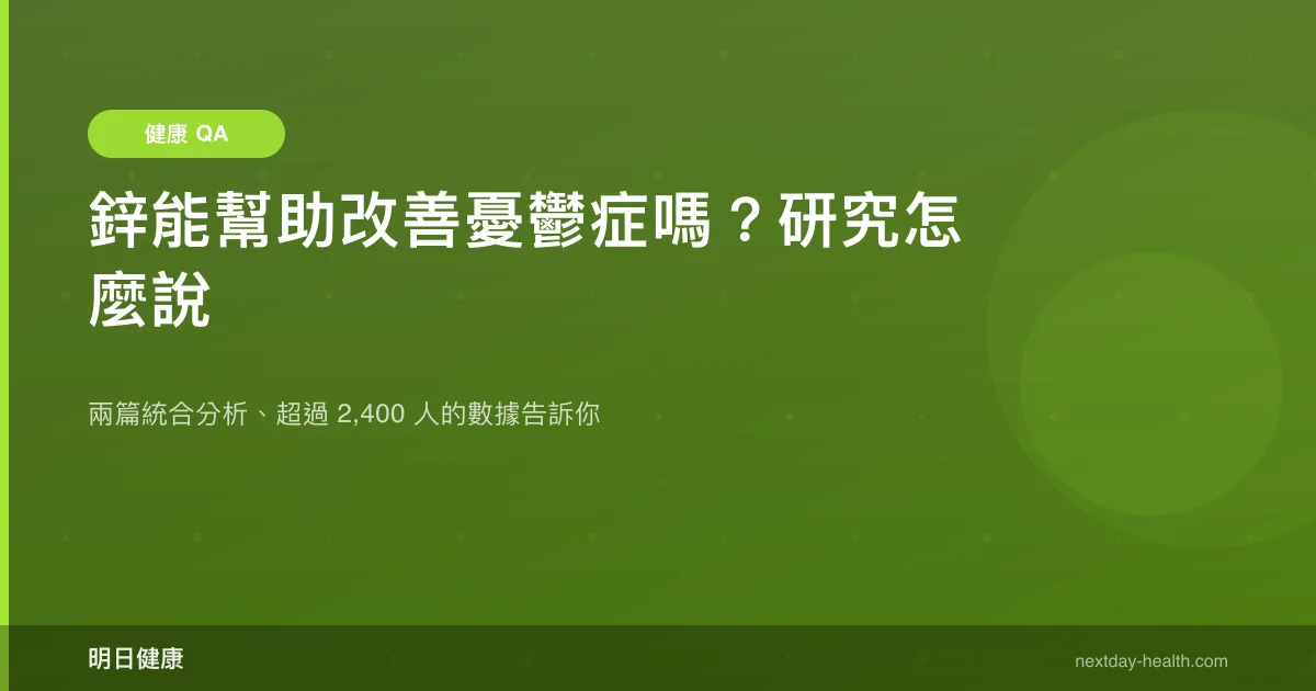 - 憂鬱症患者血鋅比健康者低約 1.85 µmol/L(17 項研究、2,400+ 人,Cohen's d = 0.59)