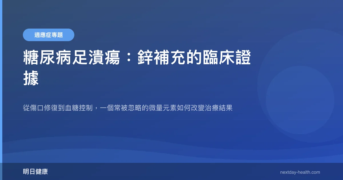 每日補充鋅 12 週,可使糖尿病足潰瘍長度縮減約 40%,同時將 HbA1c 平均壓低 0.55%——這是來自 2 篇高品質研究(共 1,760 名受試者)的數字,不是個案印象。鋅是超氧化物歧化酶與膠原蛋白合成不可或缺的輔因子,在傷口修復的分子機制中扮演核心角色,卻長期被臨床照護低估。本文從傷口癒合與代謝兩個面向,解析鋅在糖尿病足管理中的臨床意義。