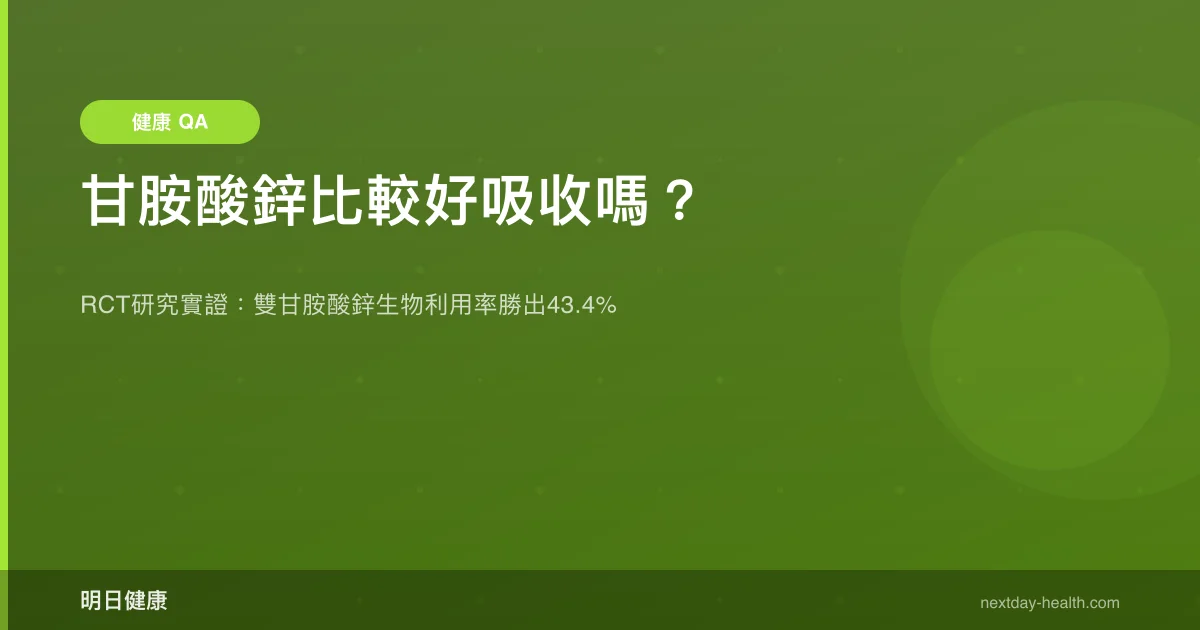 是的,甘胺酸鋅確實比一般鋅好吸收。法國研究發現,鋅雙甘胺酸鹽的口服生物利用率較葡萄糖酸鋅高出43.4%,且腸胃耐受性更好。