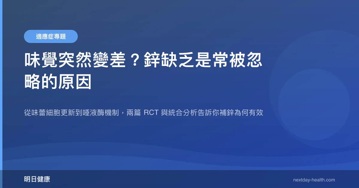 補充鋅可以改善味覺障礙,這不只是臨床直覺,而是有隨機對照試驗與統合分析支持的結論。2023 年發表於《Journal of Nutrition and Metabolism》的統合分析(PMID: 36937245)整合多項 RCT,確認鋅補充組味覺改善率顯著優於對照組;2005 年的關鍵 RCT(PMID: 15615872)更進一步顯示,即使在血清鋅正常的特發性患者身上,補鋅也能帶來客觀與主觀的雙重改善。